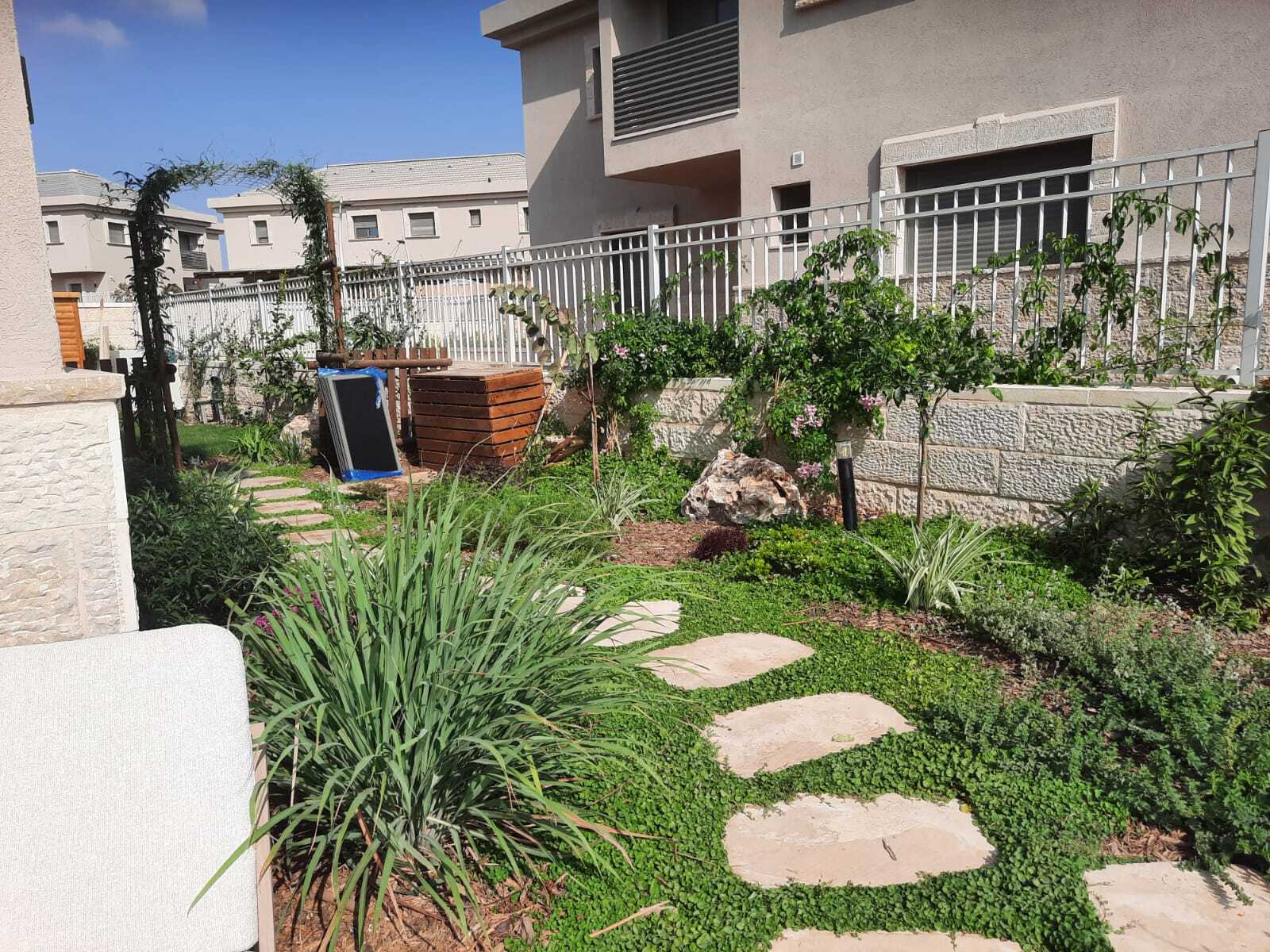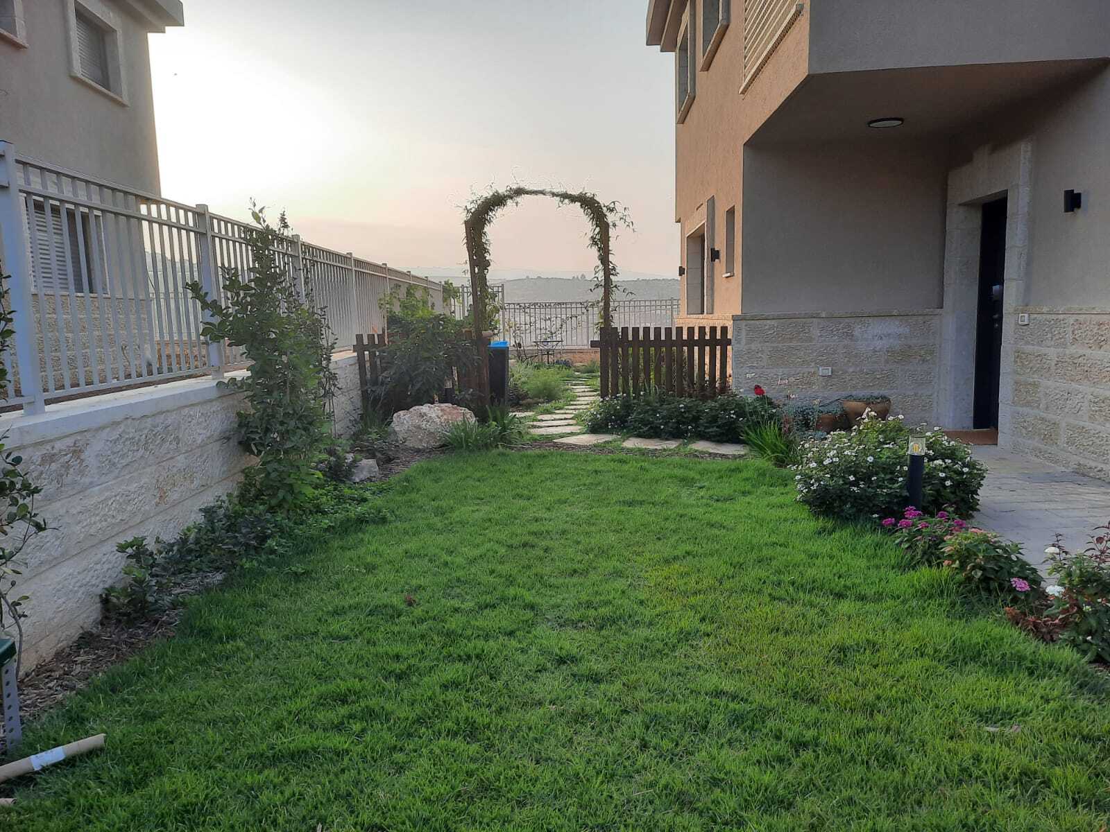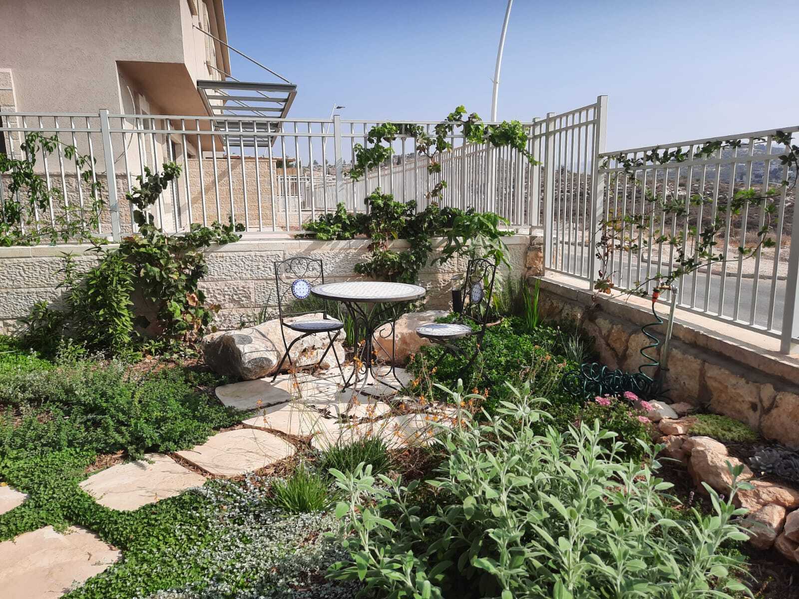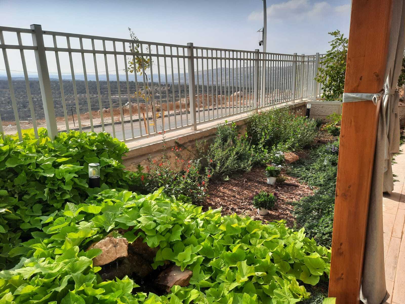 גינת קרקע ביישוב חדש, הצופה לנוף מבואות ירושלים. בעלי הבית ביקשו לשמר את הנוף ויחד עם זה לשלב צמחי מאכל וארץ ישראל רבים. בגינה זו שילבנו אלמנטים רבים כגון קומפוסטר, שער עץ מרשים, מדשאה, מסלעת סוקולנטים, תאורת גן ועציצים. כמובן שהקפדנו על השבחת הקרקע באמצעות קומפוסט, ביולוגיית קרקע וחיפוי משמעותי.